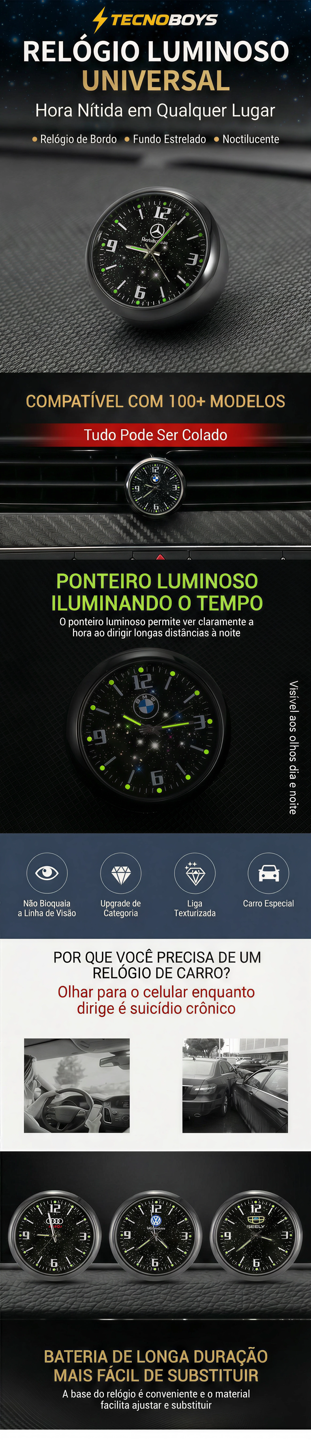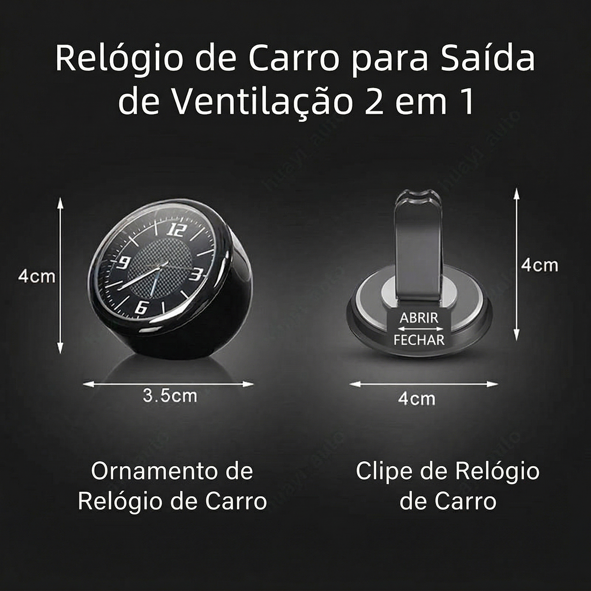 Legível Dia e Noite Um mostrador suavemente luminoso garante visibilidade clara à noite sem ofuscamento, mantendo a calma e a clareza em cada viagem. Compatibilidade Universal com o Interior Projetado para se adequar a 99% dos painéis — desde sedãs de luxo até carros compactos de cidade — com uma silhueta limpa e discreta. Duas Opções de Montagem Profissional Escolha entre o adesivo 3M de grau automotivo para uma instalação permanente e mínima, ou um clipe de ventilação usinado com precisão para uma colocação flexível. Construção em Liga Premium Fabricado em liga de zinco certificada para durabilidade, resistência ao calor e uma presença tátil sólida que suporta o uso diário. Cronometragem de Precisão em Quartzo Um movimento confiável garante desempenho preciso e estável com manutenção mínima.