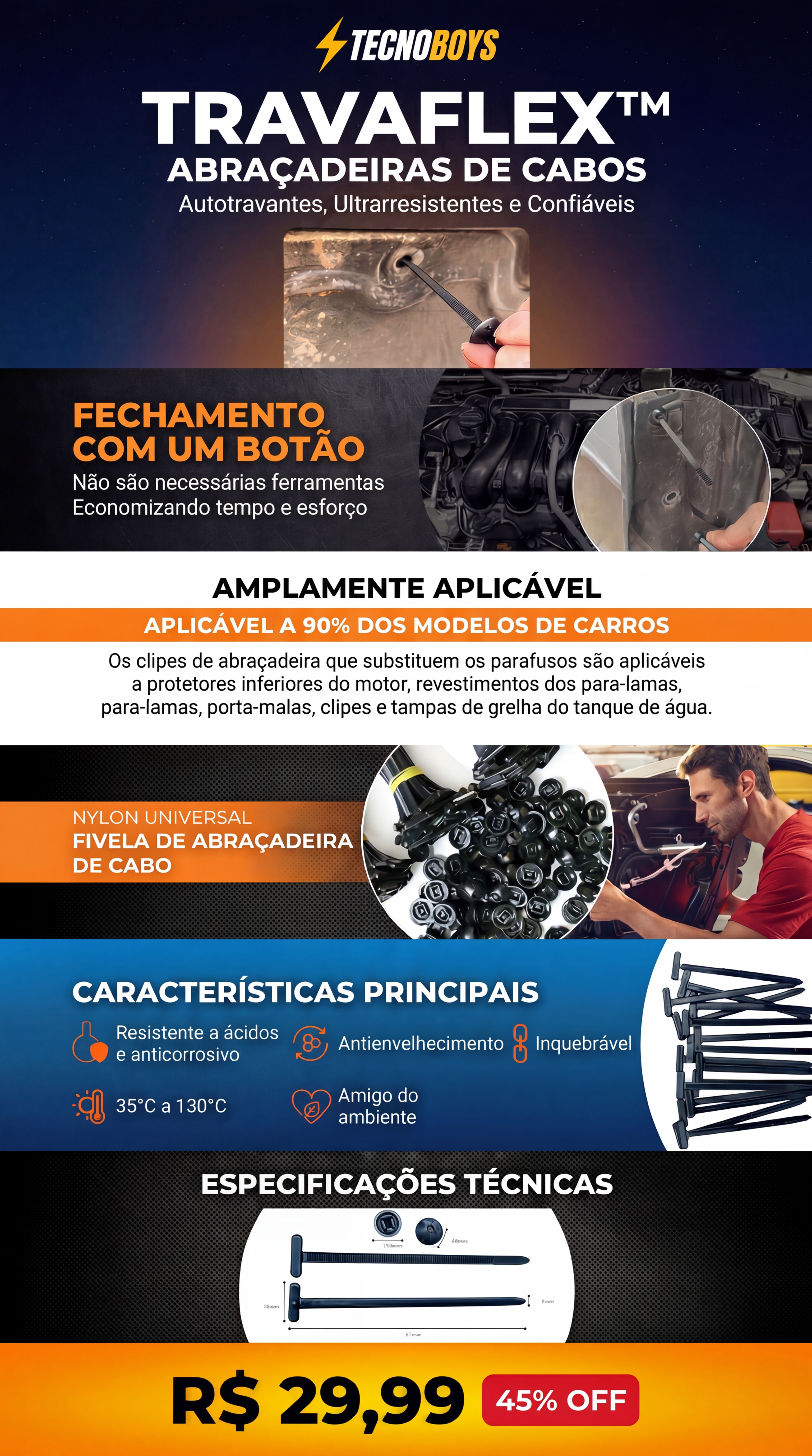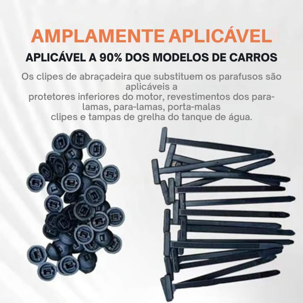 Substitua parafusos e clipes tradicionais em mais de 90% dos modelos de carros. Essas fivelas universais para abraçadeiras de nylon são perfeitas para: